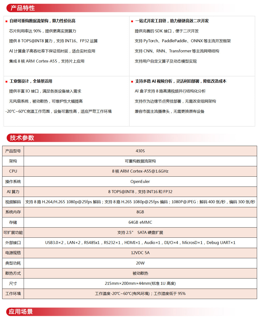 • 基于全球领先的CAISA可重构数据流架构,FSC430E边缘小站高效利用芯片资源,搭载8核ARM Cortex-A55处理器,支持8路高清视频实时智能分析,适用于智慧城市、智慧能源、智慧安监等多种应用场景的智慧化升级和系统定制需求。